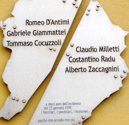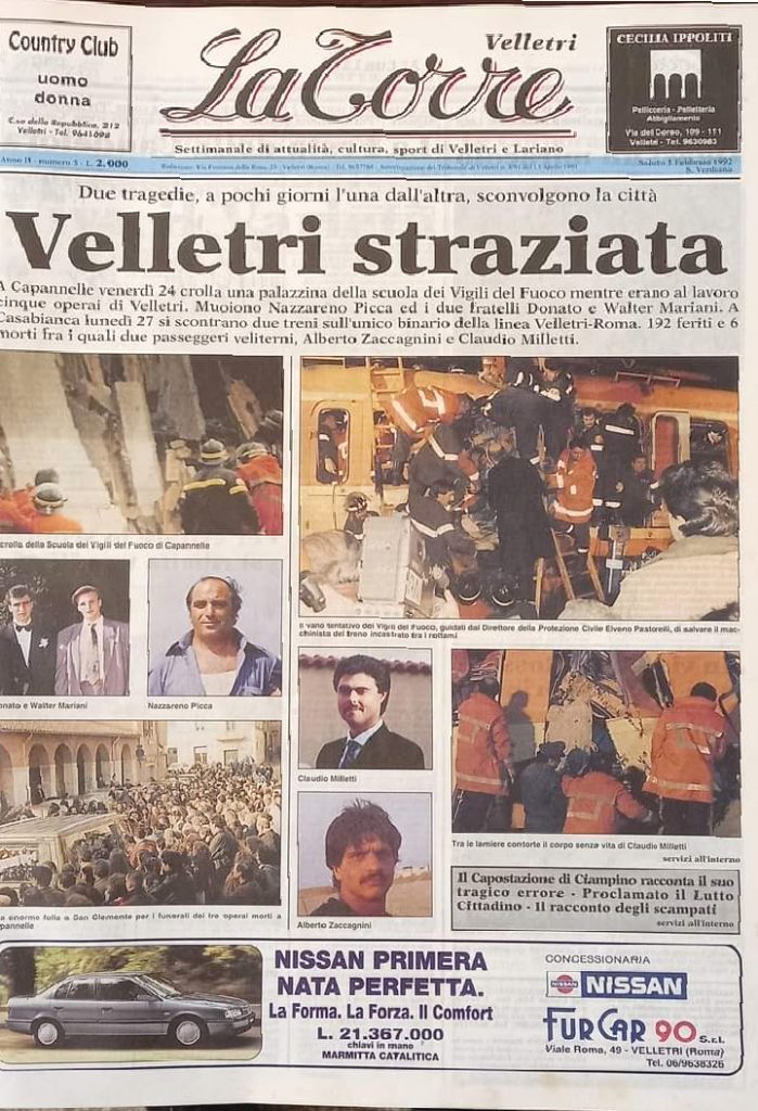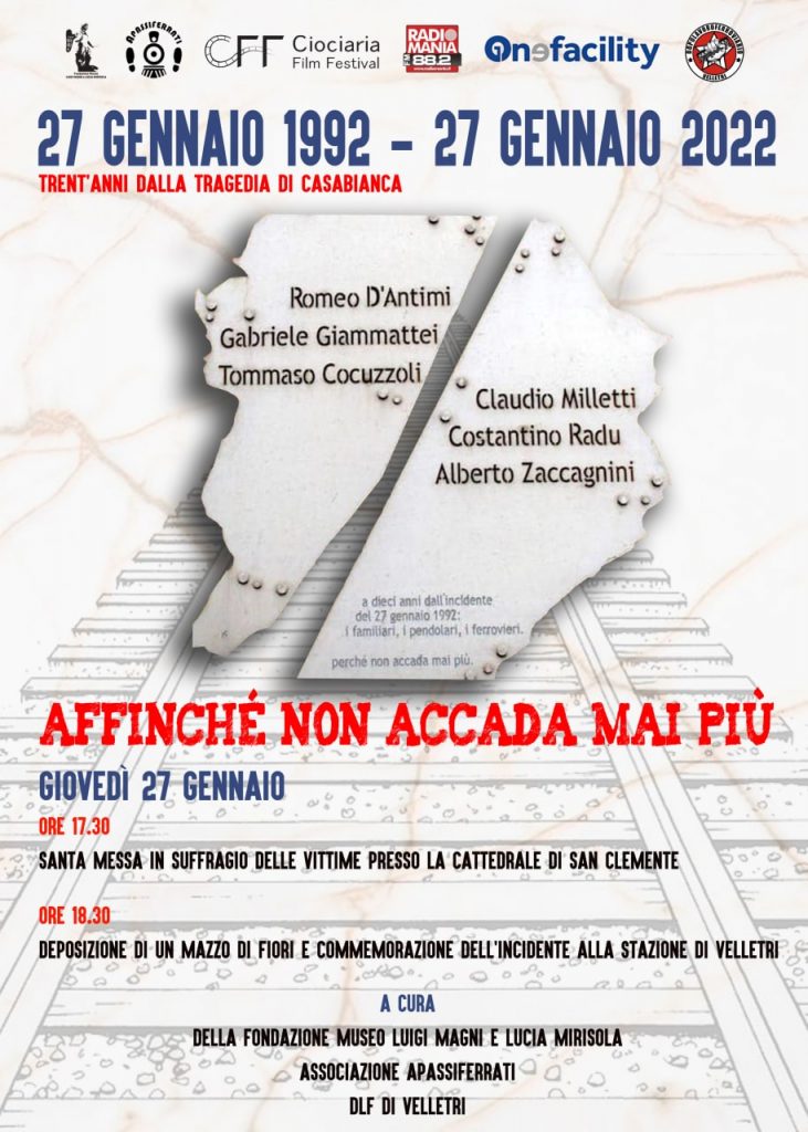 Giovedì 27 Gennaio 2022, presso la Cattedrale di San Clemente alle ore 17.30 avrà luogo la celebrazione in suffragio delle vittime Romeo D’Antimi – Gabriele Giammattei – Tommaso Cuzzoli – Claudio Milletti – Costantino Radu e Alberto Zaccagnini, dopo la Santa Messa alla stazione di Velletri avrà luogo la commemorazione dell’incidente con la deposizione di un mazzo di fiori. L’invito è a partecipare perché la memoria sia oggi il fondamento principale per trarre le basi per un nuovo vivere fatto della riscoperta di certi valori per tramandare alle future generazioni certi avvenimenti dai quali trarre le forza per lavorare per un futuro migliore.