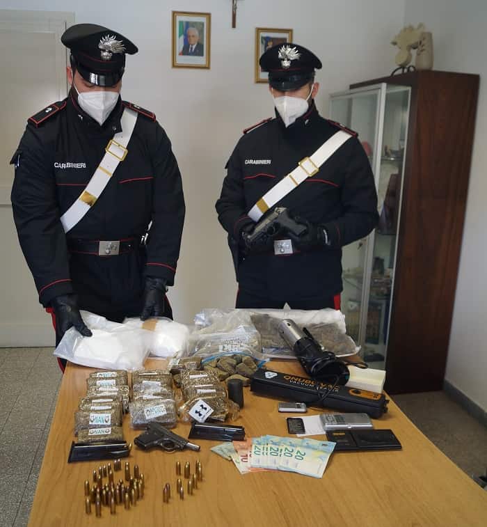 Nell’abitazione sono stati ritrovati più di 5 kg di sostanze stupefacenti (3,5 Kg di hashish, circa 1,3 Kg di cocaina, più di 600 g di marijuana) oltre a due pistole illegalmente detenute ed un centinaio di proiettili. Tutto io materiale è stato prontamente sequestrato. Ulteriori indagini sono ora in svolgimento presso il laboratorio di balistica del R.I.S. di Roma sulle armi, al momento non sembrano oggetto di furto.