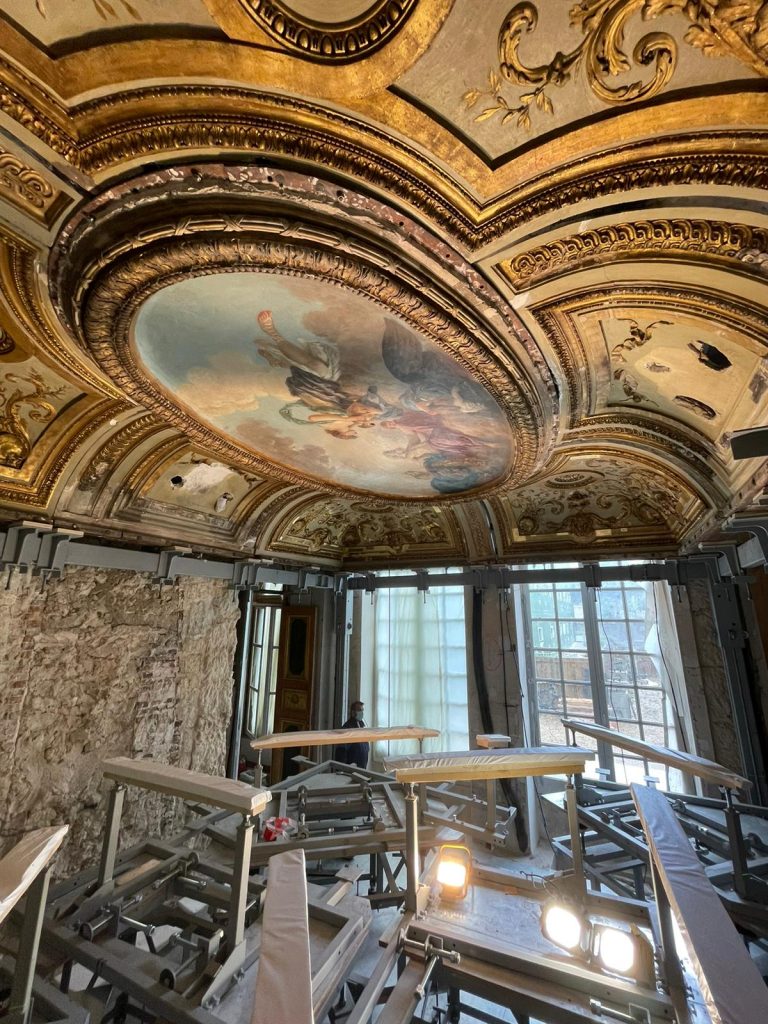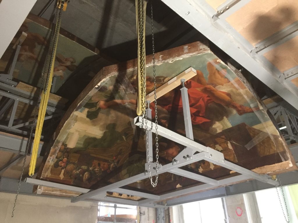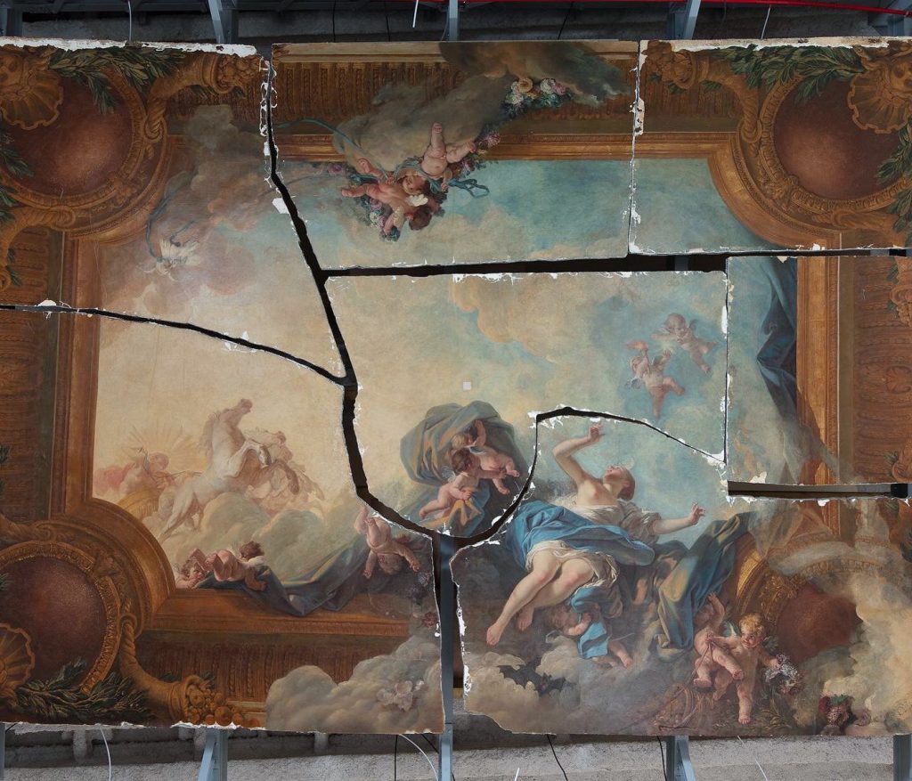 I soffitti decorati furono “strappati” dai loro supporti originari; vennero realizzati calchi in gesso degli stucchi originari; le sculture e le boiseries vennero conservate in casse di legno. L’impresa fu notevole: basti pensare che la volta in gesso dipinta dal Coypel, grande 8×8 metri e spessa solo 1cm, dovette essere “tagliata” in 10 conci e consolidata con un complesso insieme di nervature prima di poter essere trasportata e stoccata negli archivi della Banca di Francia.