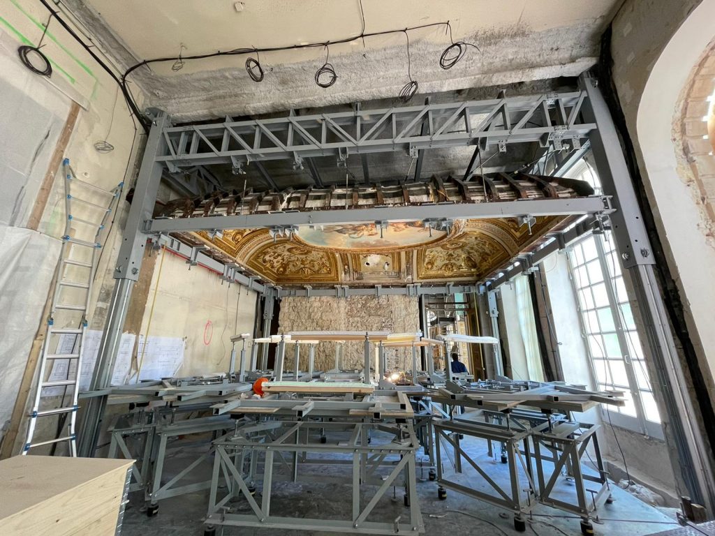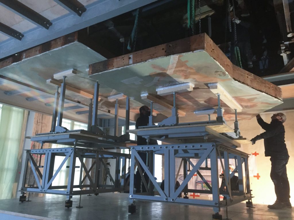 Lo studio Bucci And Partners, con sede a Parigi e Velletri, diretto dall’Ing. Pierluigi Bucci, ha sviluppato e seguito tutte le fasi di movimentazione ed assemblaggio, fino al sollevamento finale, in un solo blocco di ciascuno dei controsoffitti dipinti.