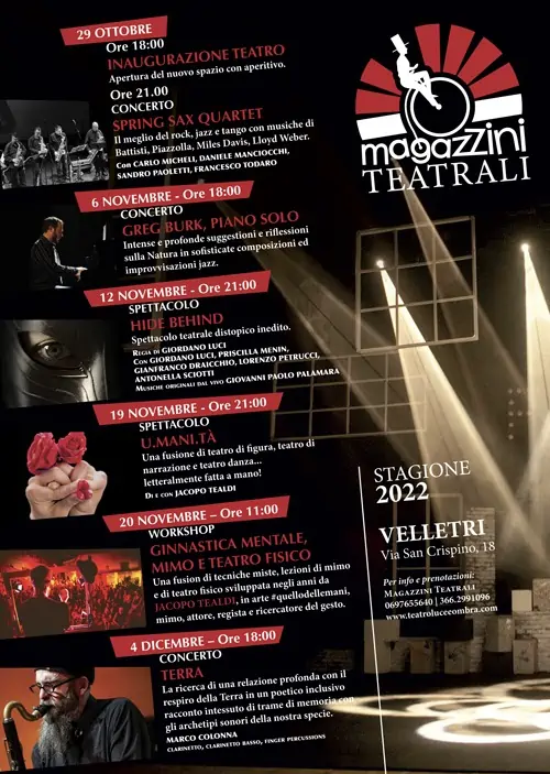 Nascono a Velletri i “Magazzini Teatrali”, nuova realtà teatrale che, come ci hanno voluto raccontare i maestri Gennaro Duccilli e Sergio Gotti, direttori artistici del progetto, intervistati dalla redazione a seguito dell’inaugurazione avvenuta il 29 novembre, conserva tante idee, voglia e calore. Il calore delle origini che siano esse quelle Veliterne, della via in cui ora sorge il teatro o quelle della tradizione napoletana, con i suoi spiritelli e con il gusto del teatro off sperimentale.
