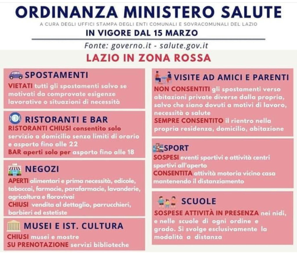 - Il Lazio sarà zona rossa dal 15 marzo 2021 al 2 aprile, ciò significa innanzitutto che “gli spostamenti per far visita ad amici o parenti autosufficienti e, in generale, tutti gli spostamenti verso abitazioni private abitate diverse dalla propria non dovuti a motivi di lavoro, necessità o salute sono vietati fino al 2 aprile e nella giornata del 6 aprile 2021”.