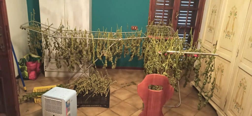 Durante la perquisizione le Forze dell’ordine hanno sequestrato una consistente quantità di canapa indiana, individuata sia all’interno dell’abitazione sia in un terreno adiacente ad essa. Al termine dell’intervento sono stati resi noti i numeri della confisca: 30 piante già tagliate per un totale di 53,1 chili, una quarantina di piante “nascoste” tra i filari di una coltivazione di pomodori e 310 infiorescenze già essiccate.